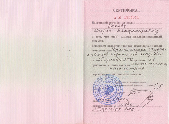 - действующий сертификат по психотерапии и психиатрии;